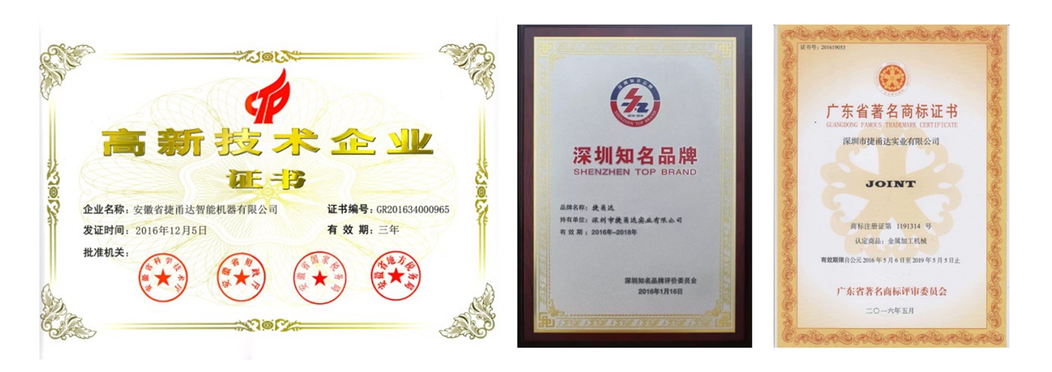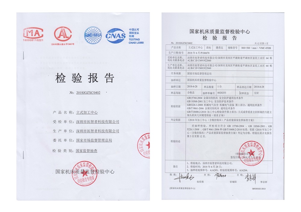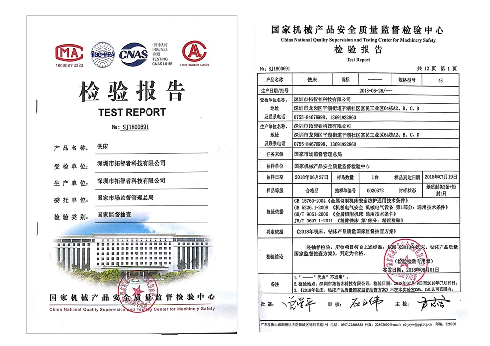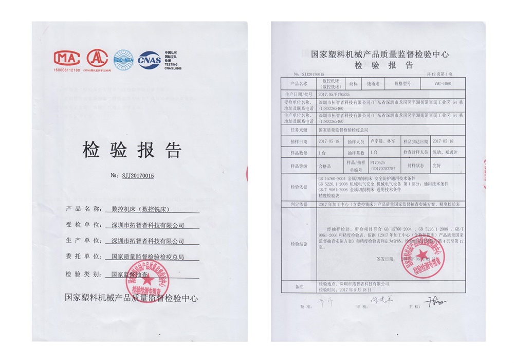 深圳市拓智者科技有限公司產(chǎn)品連續(xù)多年順利通過了國家市場監(jiān)督管理總局、國家質(zhì)量監(jiān)督檢疫總局質(zhì)量檢測并出具頒發(fā)權(quán)威的質(zhì)量檢驗(yàn)報(bào)告, 表明捷甬達(dá)機(jī)床的質(zhì)量制度、質(zhì)量保證能力等得到國家認(rèn)證機(jī)構(gòu)的認(rèn)可。