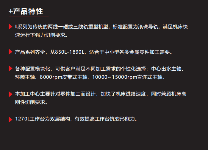 L系列整機(jī)以快速剛性加工為基本設(shè)計(jì)出發(fā)點(diǎn),為零部件量產(chǎn)、加工精度、加工效率最大化提供保證;高效排屑、快速進(jìn)給及主軸高速功能的組合模塊化,滿足客戶不同加工需求的個性化選擇;影響整機(jī)品質(zhì)的關(guān)鍵部件采用進(jìn)口優(yōu)質(zhì)配件。